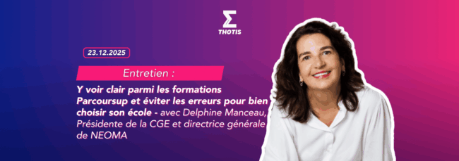 Dans un entretien pour Thotis, Delphine Manceau, Présidente de la CGE (Conférence des Grandes Écoles) et directrice générale de NEOMA, partage ses conseils experts pour accompagner les familles et les jeunes dans leur projet d’orientation et en éviter les pièges.  Elle revient notamment sur les critères permettant d’évaluer l’adéquation d’une formation avec le profil d’un…