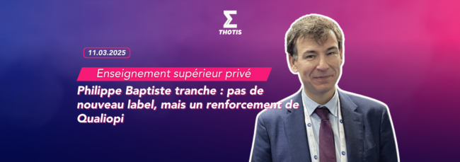 Philippe Baptiste, ministre en charge de l’Enseignement supérieur et de la Recherche, annonce qu’il n’y aura finalement pas de nouveau label sur la qualité des formations, lors d’un entretien au journal Les Échos publié le 9 mars 2025. À la place, il est prévu « le renforcement du dispositif existant Qualiopi sur des critères de qualité…
