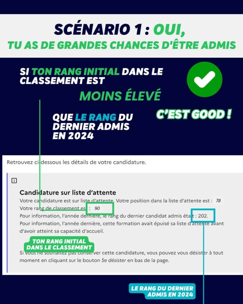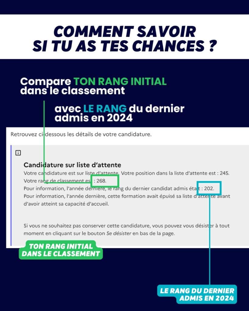 Pour savoir si tu as tes chances d’être admis en liste d’attente, il te suffit de comparer ton rang initial dans le classement avec le rang du dernier admis en 2024.