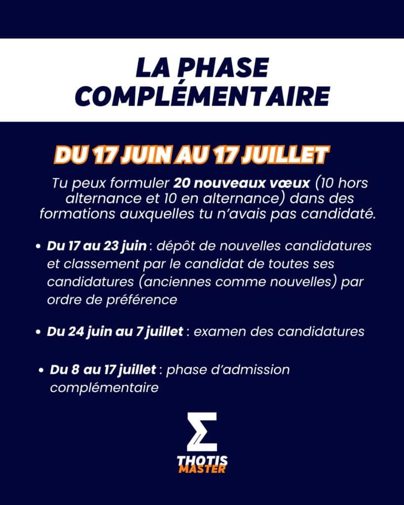 Si à l’issue de la phase principale d’admission, aucune de tes candidatures n’a été retenue, tu pourras déposer de nouvelles candidatures lors de la phase complémentaire du 17 juin au 17 juillet 2025. En cas de questions, tu peux appeler ce numéro vert : 0 800 002 001.