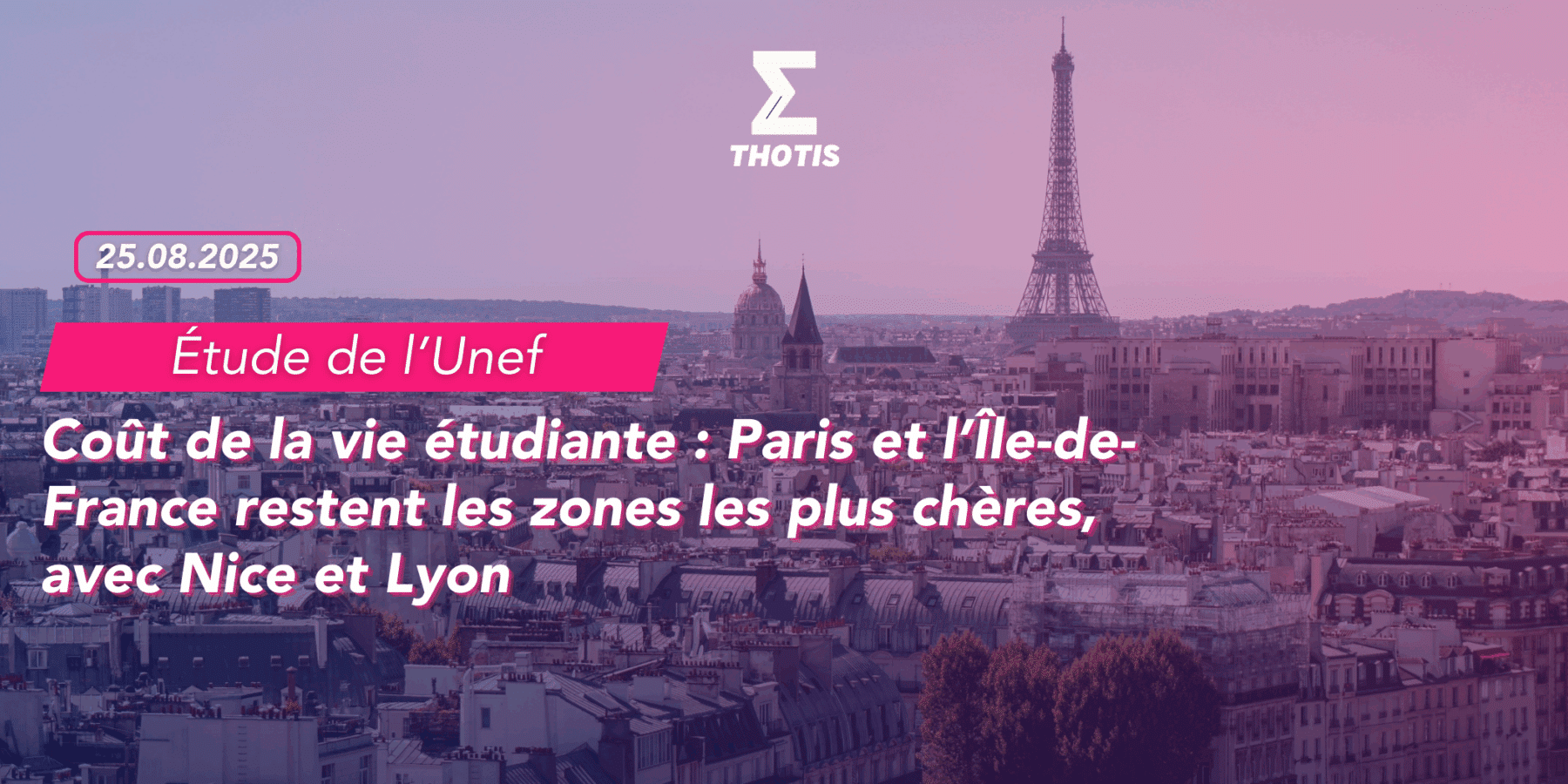 Après la publication de son enquête annuelle sur le coût de la vie étudiante – qui augmente de 4,12 % par rapport à 2024 –, l’Unef publie un classement de ce coût (loyer et transport) par ville universitaire, le 20 août 2025. La ville de Paris reste la plus chère avec un coût estimé à 1 627 euros par mois (+4,13 %) et Limoges, la moins chère pour étudier (1 073 euros, +6,06 %).
