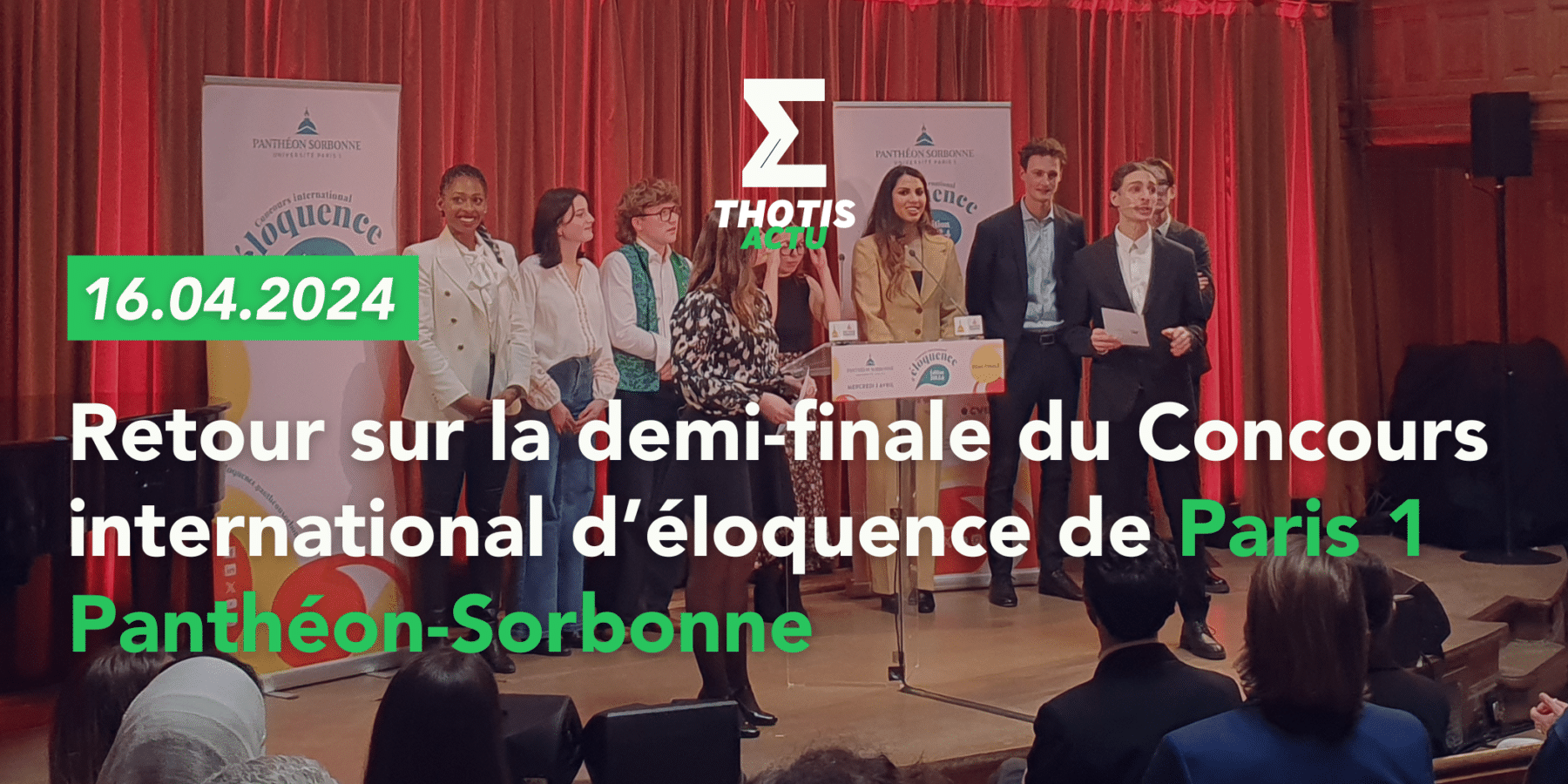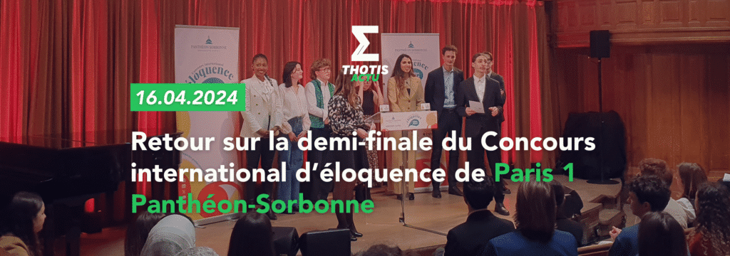 Au début du mois d’avril, Thotis s’est rendu dans le célèbre amphithéâtre Richelieu de La Sorbonne pour assister à la demi-finale de l’édition 2024 du Concours International d’éloquence de l’université Paris 1 Panthéon-Sorbonne. À cette occasion, 16 concurrents déterminés à décrocher une place en finale, sélectionnés parmi plus d’une centaine de participants, ont ainsi déclamé leur texte argumenté, en Français. À l’issue de cette soirée, seuls 8 participants ont été sélectionnés pour participer à la grande finale, le 24 avril prochain au Panthéon.